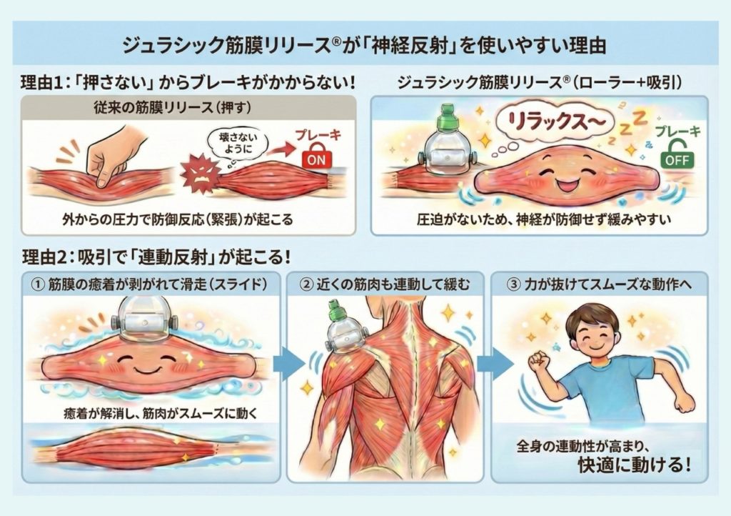 ジュラシック筋膜リリースが、他の筋膜リリースより神経反射を使いやすい理由は明確です。